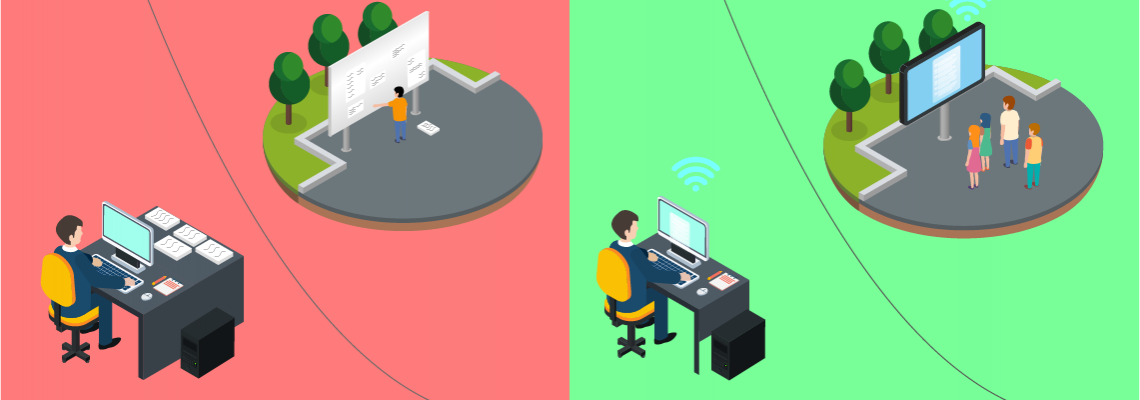 Un pilier public numérique (écran LCD extérieur) dont le contenu est géré directement depuis un navigateur Web.